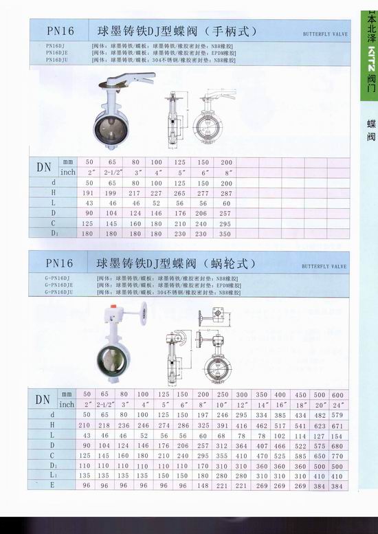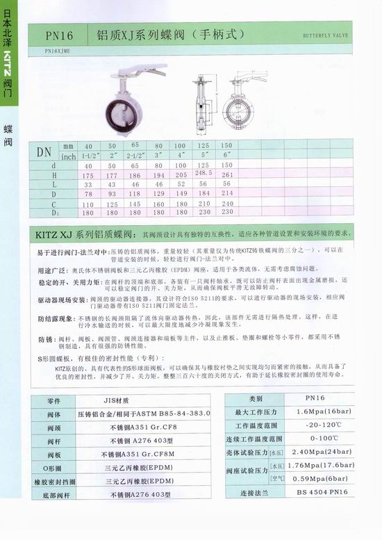 日本北澤KITZ蝶閥蝶閥不僅結(jié)構(gòu)簡(jiǎn)單、體積小、重量輕、材料耗用省,安裝尺寸小,而且驅(qū)動(dòng)力矩小,操作簡(jiǎn)便、迅速,并且還同時(shí)具有良好的流量調(diào)節(jié)功能和關(guān)閉密封特性,在大中口徑、中低壓力的使用領(lǐng)域,蝶閥是主導(dǎo)的閥門形式。手柄式 型號(hào):PN16DJ (球墨鑄鐵蝶板) 蝸輪式 :G-PN16DJ (球墨鑄鐵蝶板) PN16DJU (不銹鋼蝶板) G-PN16DJU (不銹鋼蝶板)