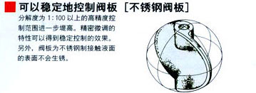 為了能在壓力控制比較激烈的控制器中使用,閥板為控制氣穴構造。在發生高差壓的壓力控制、差壓控制和蓄熱槽的落差壓力控制中,對需要防止落水的場合是有效的。 |