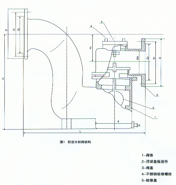 F43X-1.0T防逆水封閥主要由帶存水彎的閥體及浮球蓋板組件等組成,帶浮球的蓋板蓋在閥體的密封閥座上,將閥腔分成內(nèi)外兩部分,內(nèi)腔為清水部分,外腔通排水管道,當(dāng)內(nèi)腔充滿清水時(shí).因位于內(nèi)腔的浮球作用,蓋板壓力降低,易于開啟通流。溢流停止后,蓋板可自行復(fù)位.蓋嚴(yán)閥座,從而可嚴(yán)格阻斷臭氣及污水倒灌。如果水池進(jìn)水口浮球閥關(guān)閉良好,數(shù)年不溢流,閥腔無水,浮球可加重蓋板重量,更好地蓋嚴(yán)閥座,同樣可嚴(yán)格阻隔臭氣及防止雨、污水倒灌清水池。如果污水進(jìn)入閥體外腔,所帶雜物僅能粘附在蓋板外表面,不影響蓋板封嚴(yán)閥座。故該防逆水閥工作可靠,效果好,不易出故障。且當(dāng)有雜物沉淀時(shí).下次溢流時(shí)可自動(dòng)沖出閥體。