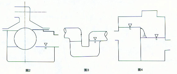 1、本防逆水封閥裝于清水池溢流管上,以前的防逆水封閥(圖2)及存水彎(圖3)或溢流井(圖4)在閥內(nèi)無水時(shí),均不能阻隔臭氣進(jìn)入清水池,而當(dāng)清水池進(jìn)口浮球鞋閥很好時(shí),尤其是新建水池,往往很少溢流甚至數(shù)年無溢流,因而,上述三種裝置均不能防止下水道臭氣進(jìn)入清水池,而本防逆水封閥的蓋板浮球結(jié)構(gòu)則可無論是否有水均可阻隔臭氣,保持清水池良好的衛(wèi)生狀況。